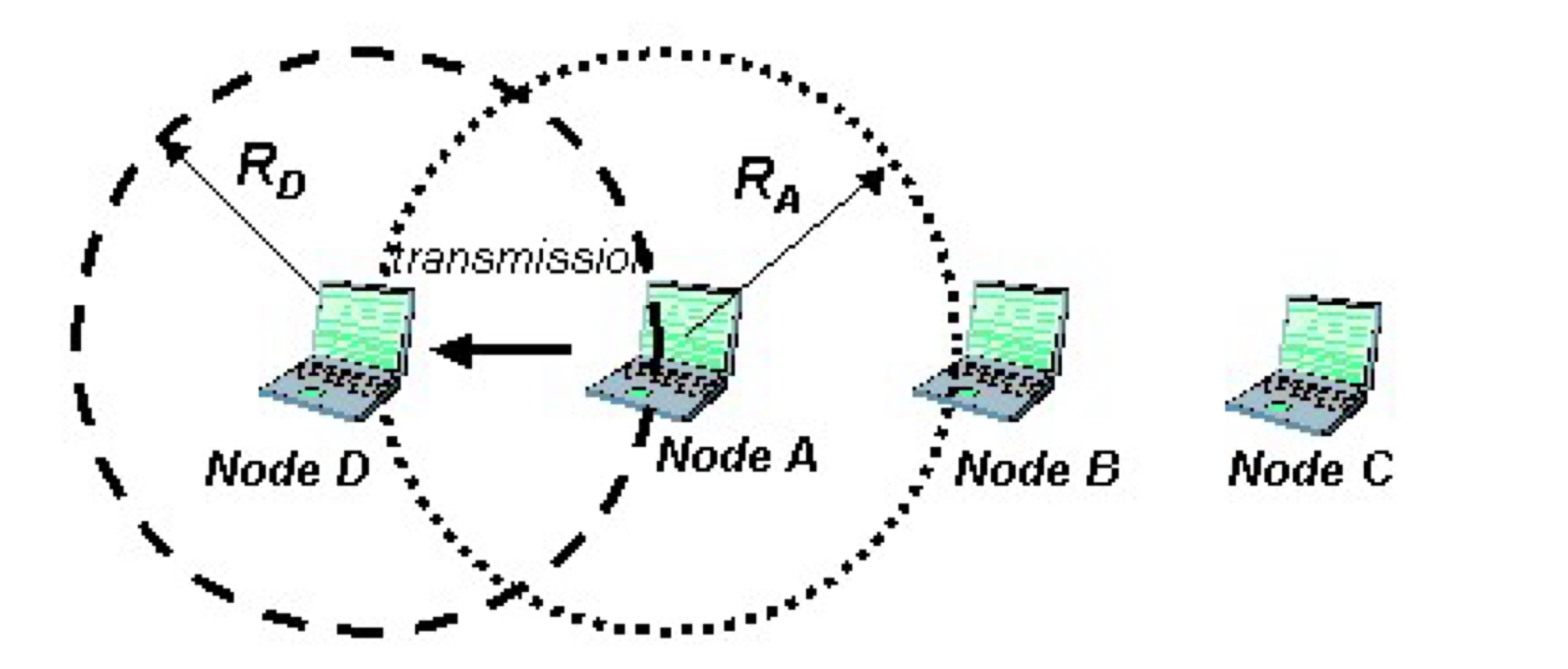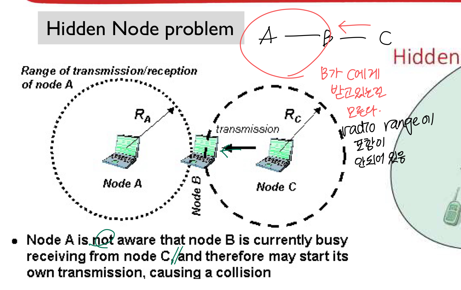 - Hidden Node Problem - 같은 Collision Domain에 있는데 서로 radio range가 바깥에 있어서 상대의 TX 감지 못함